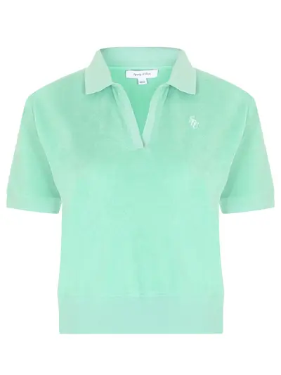 -Поло из мягкого хлопка с махровой фактурой в мятном оттенке от SPORTY&RICH. -Модель полуприлегающего силуэта с короткими рукавами, эластичными манжетами и поясом, отложным воротником, V-образным вырезом и вышитым логотипом на груди.
