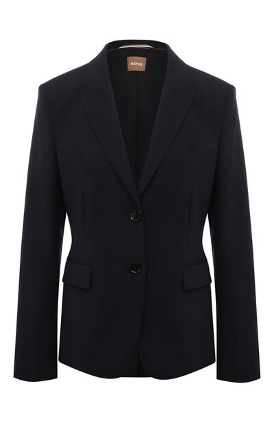 Темно-синий однотонный жакет справится с многозадачностью в гардеробе, сочетаясь с вещами разной палитры. Мастера марки, основанной Хуго Фердинандом Боссом, выполнили приталенное изделие из мягкой, но при этом плотной шерсти, которая почти не мнется. Минимум 60% сырья получили у фермерств, использующих более экологичные и этичные методы.