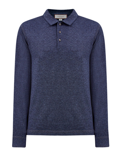 Минималистичный джемпер-поло от Canali выполнен из хлопковой пряжи с добавлением волокон кашемира, полностью натуральный состав обеспечивает максимальный комфорт в движении. Плотный и мягкий материал в меланжево-синем оттенке делает модель идеальной для создания повседневных образов. Детали: контрастная прострочка швов, отложной ворот с застежкой на пуговицы. Сделано в Италии.
