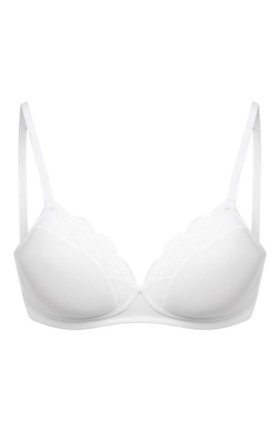 Для создания белого бюстгальтера мастера марки использовали дышащий эластичный хлопок, который не раздражает кожу. Плотные чашечки на косточках обеспечивают оптимальную поддержку груди. Модель с узкими регулируемыми бретелями декорировали ажурным цветочным кружевом.