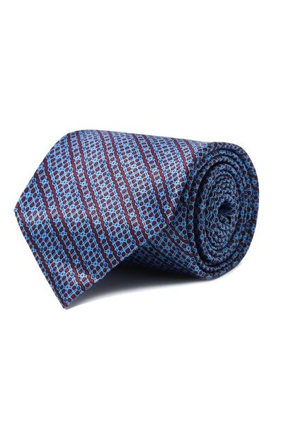 Голубой галстук с графичным узором, дополненным красными диагональными полосами, изготовили из мягкого шелка с характерным блеском, придающим мотиву глубину. Аксессуар выполнили в технике семи сложений, соединив края складок гибким ручным швом, поэтому он не потеряет форму со временем. Длины изделия хватит, чтобы завязать узел любой сложности.