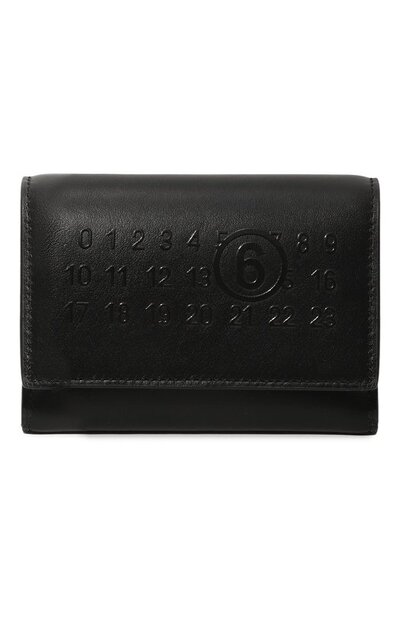 Мастера марки сшили портмоне из мягкой мелкофактурной кожи черного цвета. Широкий клапан украсили знаковым принтом в виде чисел, а на задней панели расположили несколько белых стежков. Габариты аксессуара с шестью слотами для кредитных карт, карманом для банкнот и отделением для мелочи позволяют положить его в небольшую сумку.