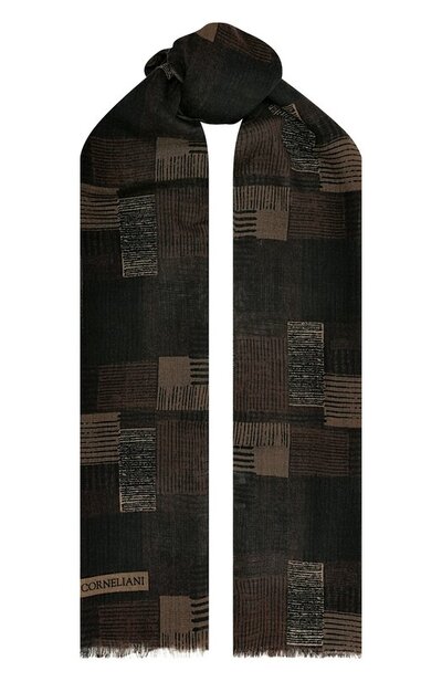 Широкий коричневый шарф выполнен из премиальной мягкой шерсти с абстрактным узором, напоминающим технику петчворк. Края отделаны короткой бахромой. Почти невесомый аксессуар отлично сохраняет тепло и легко драпируется, а его длины хватит, чтобы завязать любой узел.