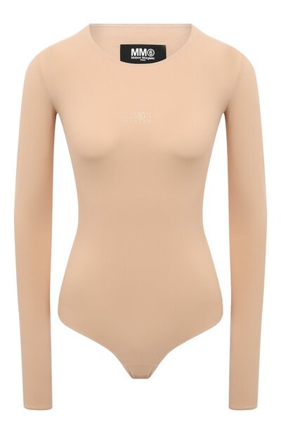 Бежевое боди с одинаковой легкостью подружится и с юбкой в тон, и с расслабленными джинсами. Мастера марки выполнили изделие из гладкого эластичного материала, который облегает фигуру так, что создает эффект второй кожи. Модель с длинными рукавами деликатно украсили спереди принтом в виде знаковых цифр.