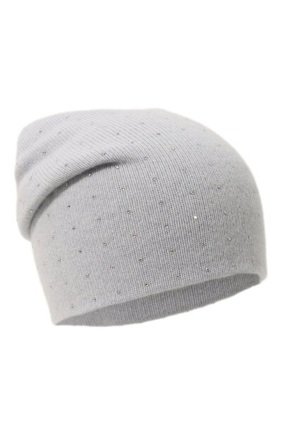 Для изготовления шапки использовали тонкую шелковистую пряжу, произведенную из легкого подпушка горных коз. Его вычесывают вручную и делать это можно всего один раз в год, поэтому руно особенно ценится. Материал окрасили в оттенок пасмурного неба, а готовую бини украсили прозрачными стразами.