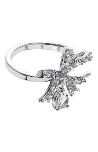 Вдохновившись бантами, команда марки создала кольцо с объемной накладкой, словно завязанной вручную из узкой ленты. Декор делает выразительнее яркий блеск полупрозрачных кристаллов, сияющих даже в приглушенном свете. Стразы, закрепленные в технике шаттонаж, рифмуются со вставками и каплевидной динамичной подвеской из циркония. Украшение выполнили из родированного ювелирного сплава.