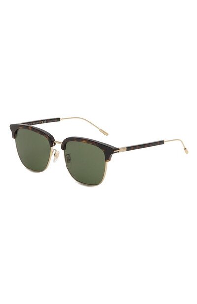 Тонкую оправу небольших квадратных очков, которые подойдут и женщинам, и мужчинам, выполнили из черепахового коричневого ацетата и блестящего золотистого металла. Узкие дужки декорировали миниатюрными вставками с логотипом, деликатно обозначив принадлежность модели бренду. Однотонные серо-зеленые линзы обеспечивают 100% защиты от ультрафиолетовых лучей.