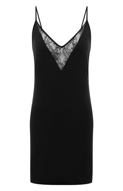 Черная сорочка с узкими бретелями и глубоким V-образным вырезом на спине сшита из гладкого тонкого модала. Материал с шелковистой текстурой отлично пропускает воздух, а комфортный крой не сковывает движения. Однотонная модель украшена спереди вставкой из ажурного кружева.