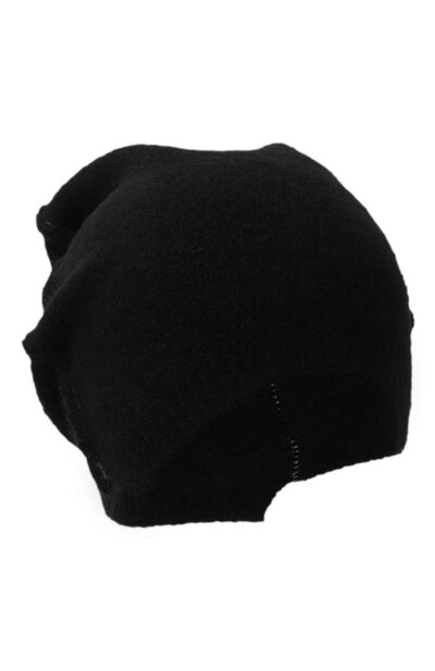 Черную шапку бини с асимметричной рифленой манжетой изготовили из нежной длинноволокнистой шерсти, хорошо удерживающей тепло. Чтобы аксессуар не потерял форму со временем и лучше сидел на голове, в состав пушистой пряжи добавили прочный нейлон и эластан. Рельефные швы придают изделию непринужденный вид.