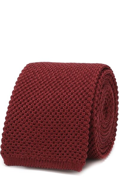 Мастера марки связали широкий бордовый галстук с прямоугольным краем из гладкой шелковой пряжи. На солнце волокна такого материала со временем теряют прочность, поэтому сушить и хранить аксессуар лучше в тени.