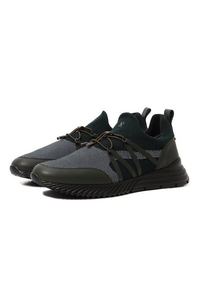 Темно-зеленые кроссовки сшили из эластичного текстиля с графичным мотивом. Модель из такого материала комфортно облегает стопу, а накладки из гладкой матовой кожи делают ее прочнее и не дают ноге подворачиваться во время ходьбы. Пару на скульптурной подошве с рельефной отделкой, напоминающей оперение орла, украсили монограммой из инициалов Стефано Риччи.