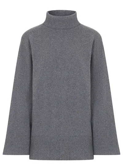 -Серый свитер из мягкого кашемира от MALO. -Модель свободного силуэта со спущенной линией плеча, длинными рукавами, рельефными манжетами, поясом и высоким воротником с отворотом.
