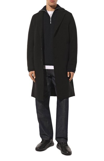 Для пошива черных кроссовок с перфорированным микроузором мастера бренда, основанного супругами Сантони, использовали зернистую мягкую кожу тонкой выделки. Нашивки вдоль шнуровки выполнили из такого же, только более гладкого материала в тон. Внутреннюю отделку изготовили из густой овчины. Модель установили на широкую подошву с крупным волнообразным рельефом.