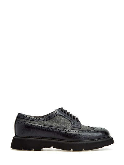 Комбинированные дерби в стиле smart casual от Doucal’s сочетают мягкую зернистую кожу и плотный твид. Брогированная отделка и шнуровка открытого типа вносят в образ неформальный штрих. Амортизирующая подошва с противоскользящим протектором обеспечивает комфорт в любых погодных условиях. Сделано в Италии.