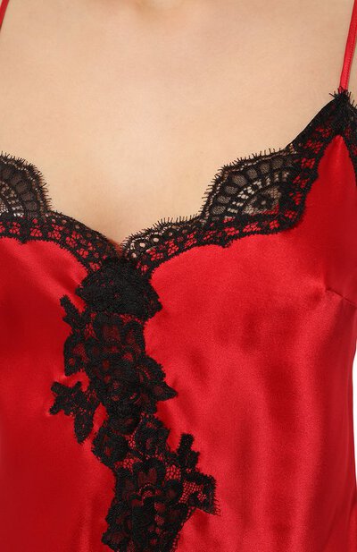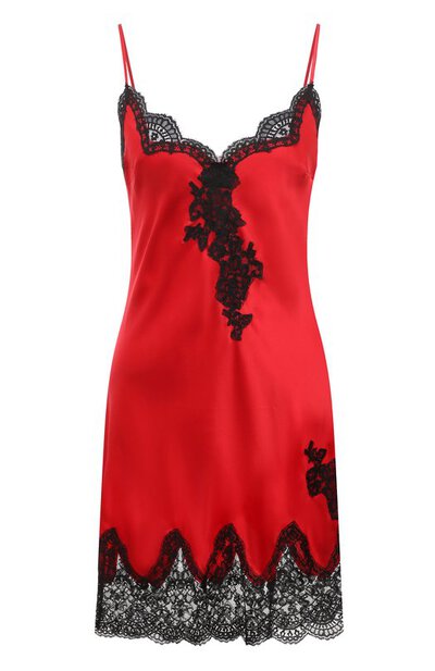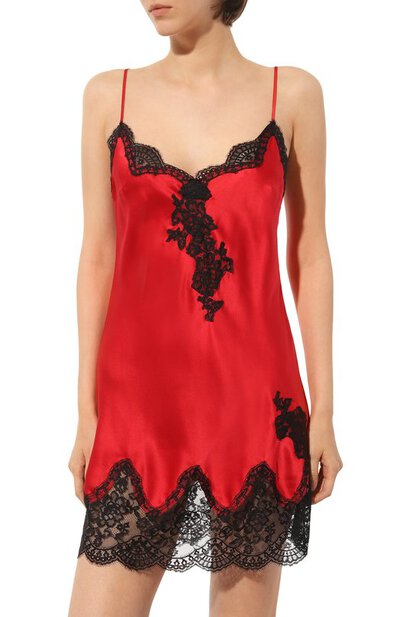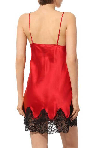 Короткую красную сорочку с узкими регулируемыми бретелями сшили из легкого шелкового атласа. Нежная ткань едва ощущается на теле, поэтому в изделии будет комфортно. Лиф украсили фигурной отделкой из ажурного полупрозрачного кружева. Из такого же материала выполнили аппликации и вставку на подоле.