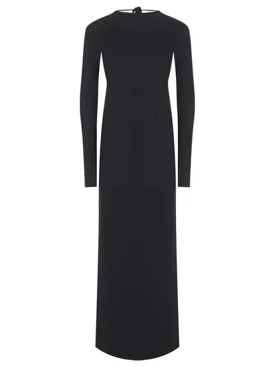 -Черное платье-макси из тонкого трикотажа купажированного состава от SASHAVERSE. -Модель в пол с кроем по фигуре, длинными рукавами, открытой спиной и длинными шнурками сзади.