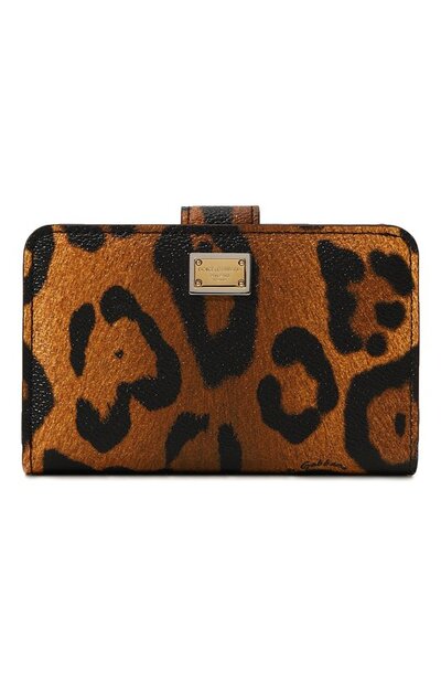 Коричневый прямоугольный кошелек выполнили из прочного фактурного материала Crespo с леопардовым принтом. Переднюю панель дополнили небольшой золотистой накладкой с логотипом бренда. В аксессуар, который закрывается хлястиком с кнопкой, разместили отсеки для купюр, слоты для банковских карт и карман для монет.