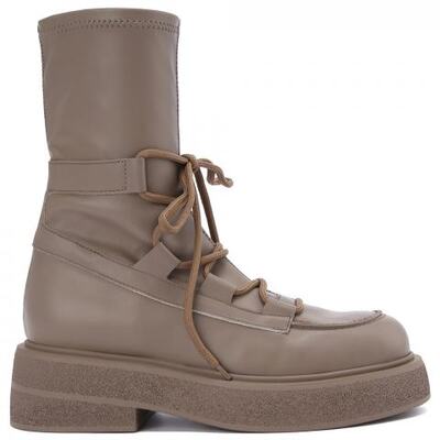 Ботинки из очень мягкой искусственной кожи от Principe di Bologna. Бежевые высокие ботинки из осенней коллекции станут базовой парой в гардеробе. Модель выполнена на массивной подошве из резины, с утеплённой шерстяной подкладкой и стелькой из натурального меха. Мягкая и эластичная кожа плотно облегает ногу, создавая идеальный силуэт. Фиксирует пару на ноге текстильная шнуровка в цвет.