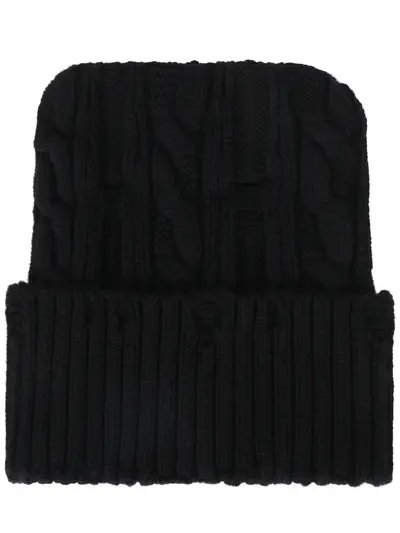 -Черная вязаная шапка-бини из шерсти от AND THE BRAND. -Модель фактурной вязки косицами с декоративными спущенными петлями и эластичной манжетой-отворотом, которая надежно фиксирует изделие на голове и не передавливает кожу.