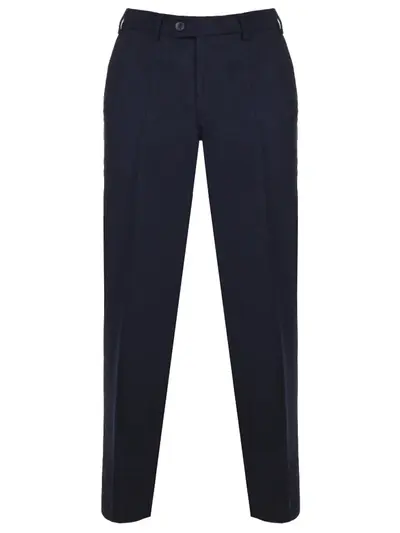 -Темно-синие брюки из тонкой шерсти от HILTL. -Классический крой, средняя посадка, пояс со шлевками, прорезные карманы, застежка на молнию и пуговицу, графичные стрелки.