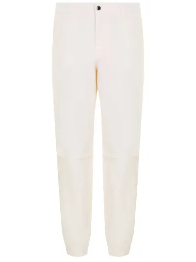 -Кремовые брюки из смесового хлопка от BOGNER. -Модель полуприлегающего силуэта с манжетами на резинке в нижней части брючин, поясом со шлевками, прорезными карманами, декоративными швами на коленях, застежкой на молнию и пуговицу.