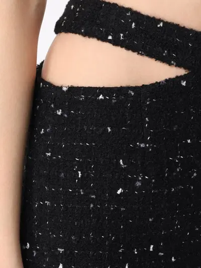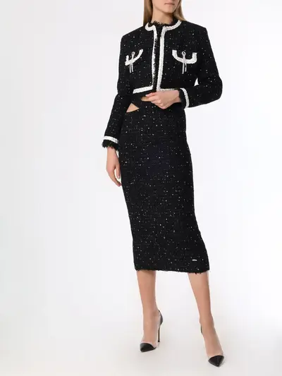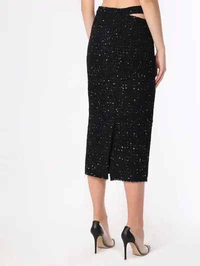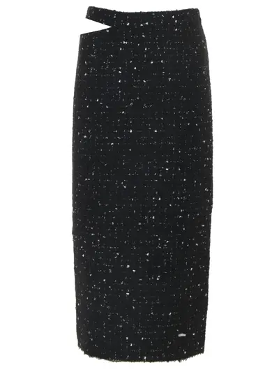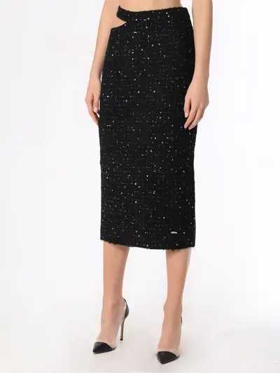 -Черная юбка-миди из твида купажированного состава от FORTE DEI MARMI COUTURE. -Модель облегающего кроя с высокой посадкой, вырезом на бедре, шлицей и застежкой на молнию сзади.