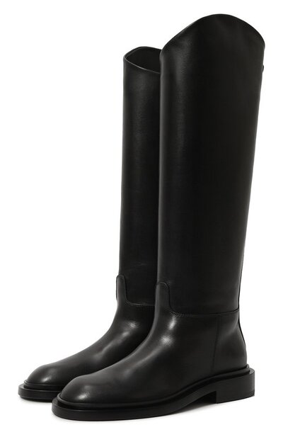 Черные сапоги Andrea с небольшой петлей на заднике почти точно копируют обувь для конного спорта. Совпадают и высокий силуэт с плавно изогнутым верхом, и небольшой устойчивый каблук, и гладкая мягкая кожа, которую тщательно отполировали до яркого блеска. Отличаются только конструкция без застежки и фактурная овчина внутри, которая адаптирует пару к холодам.