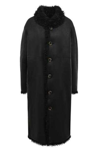 Черную двустороннюю дубленку длиной до колен выполнили из мягкой овчины. С одной стороны у этого материала — мелкозернистая фактура, подчеркнутая матовым блеском, а с другой — густой, приятный на ощупь мех, который позволяет превратить модель в шубу. Изделие застегивается крупными пуговицами с черепаховым узором.