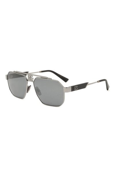 Принадлежность серебристых солнцезащитных очков марке обозначили вставками в виде монограммы DG, подчеркнув ею и двойной мост, и фигурные дужки. Для изготовления аксессуара использовали легкий прочный металла и черный полимер с деликатным блеском. Затемненные линзы надежно защищают глаза от ультрафиолета.