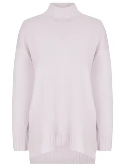 -Пастельно-розовый вязаный свитер из кашемира от PANICALE. -Модель свободного силуэта со спущенной линией плеча, длинными рукавами, рельефными манжетами, поясом и высоким воротником.