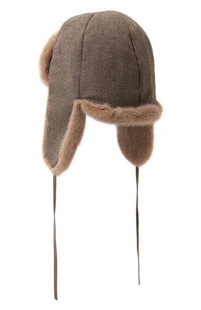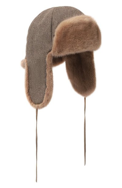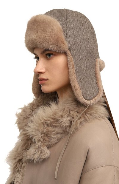 В бежевой шапке-ушанке будет комфортно даже в сильные русские морозы. Модель из прочного плотного драпа, который защищает от ветра и мокрого снега, утеплили пушистым густым мехом норки. Длинные наушники дополнили тонкими завязывающимися шнурами, выполненными из тонкой замши.