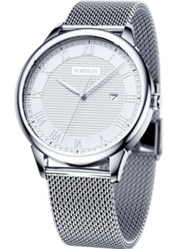 Кварцевые часы. Водостойкость WR 30. Центральные часовая, минутная и секундная стрелки. Индикация даты. Серебристый циферблат с часовыми индексами в виде цифр. Корпус выполнен из нержавеющей стали. Диаметр корпуса 42 мм. Устойчивое к возникновению мелких механических повреждений минеральное стекло. Браслет миланского плетения, выполнен из нержавеющей стали. Ширина браслета 18 - 20 мм. Застежка и заводная головка выполнены из нержавеющей стали.