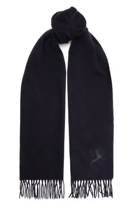 Бежевый длинный шарф мастера марки изготовили из нежного, почти невесомого кашемира. Тонкий материал поддерживает оптимальный микроклимат и почти не ощущается на плечах. Аксессуар с бахромой по краям декорировали эмблемой бренда: ее выполнили из кожи аллигатора и подчеркнули вышивкой в тон.