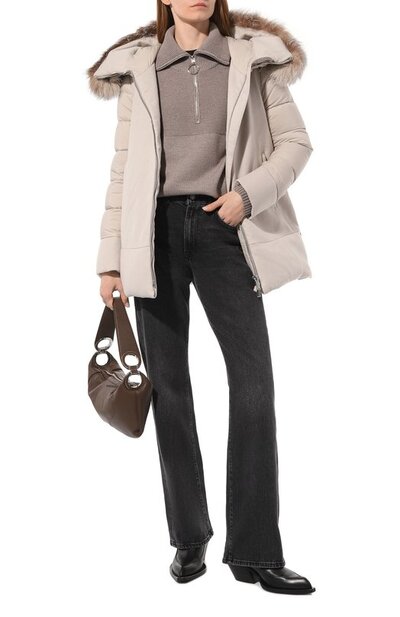 Для пошива бежевой утепленной куртки использовали плотный непродуваемый текстиль на основе мягкой шерсти и нежного кашемира. Этому матовому материалу противопоставили шелковистый нейлон, из которого выполнили стеганые рукава. Глубокий капюшон дополнили опушкой из густого меха песца с длинным ворсом. Модель застегивается встречной молнией.