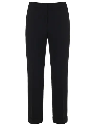 -Модель зауженного кроя длины 7/8 со средней посадкой, поясом, прорезными карманами, отворотами в нижней части брючин, застежкой на молнию, графичными стрелками, которые визуально вытягивают силуэт.