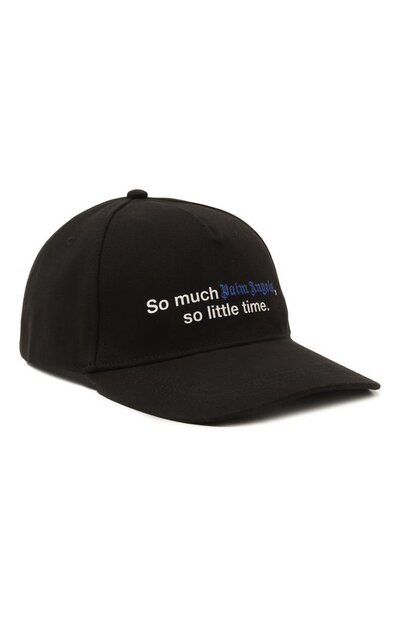 Фирменный логотип на этой бейсболке стал частью ироничного слогана So much Palm Angels, so little time. Белую надпись напечатали на плотном черном твиле из чистого хлопка, а фирменную символику вышили синими нитями. Рельефная версия названия бренда притаилась и на полимерном ремешке сзади, который регулирует посадку аксессуара.