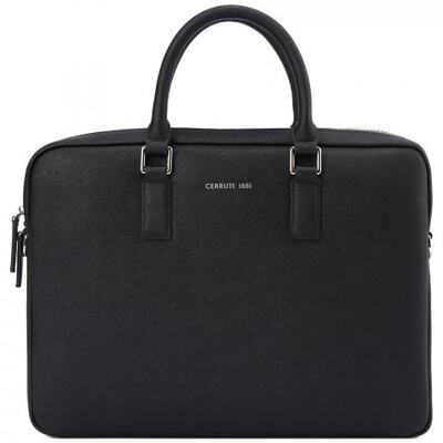 Сумка для ноутбука из чёрной кожи от Cerruti 1881. Сумка с регулируемым плечевым ремнём и удобными ручками. Основное отделение закрывается на двойную молнию. Внутри текстильная подкладка, большой карман на молнии и открытые карманы-слоты. О принадлежности к бренду сообщает объёмный логотип Cerruti 1881.