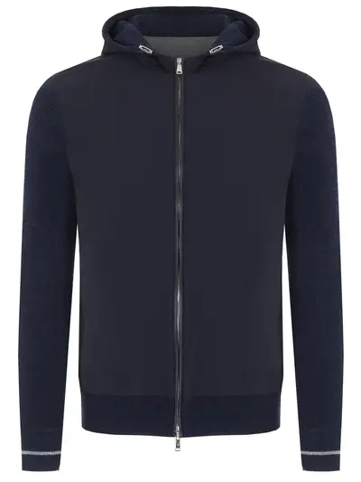 -Темно-синяя комбинированная куртка из плотной плащевки и трикотажа от FIORONI CASHMERE.