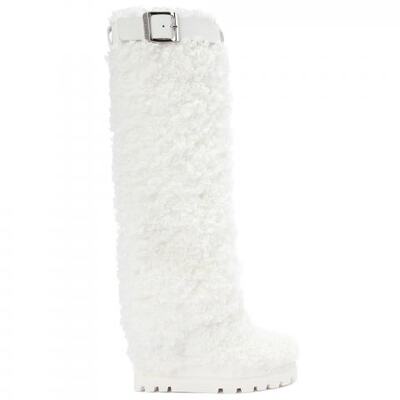 Сапоги из искусственного меха от Casadei. Сапоги в белом цвете выполнены из фигурного искусственного меха и украшены металлической пряжкой. Дизайн дополняет практичная резиновая подошва. В городе или в горах, сапоги Yeti станут символом энергичного и современного образа для холодного сезона.