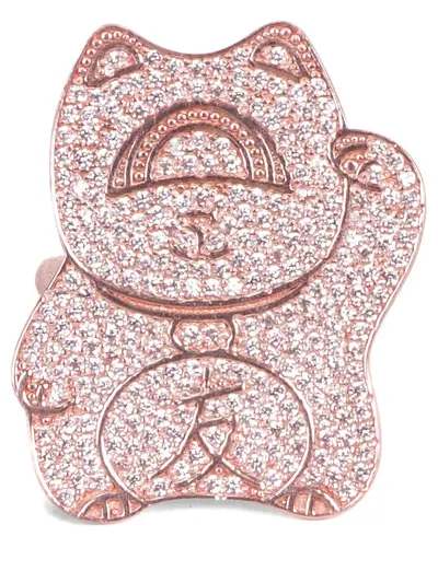 -Розовое кольцо из бижутерного сплава лимитированной капсульной коллекции Deep Fried Friends X SASHAVERSE. -Модель в виде котика – символики DFF с паве из розовых фианитов и металлом такого же оттенка.