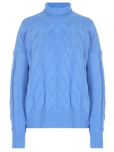 -Синий свитер из смесовой шерсти с фактурной вязкой косицами от ANNECLAIRE. -Модель полуприлегающего силуэта со спущенной линией плеча, длинными рукавами, рельефными манжетами, поясом и высоким воротником.