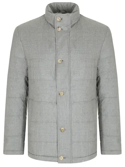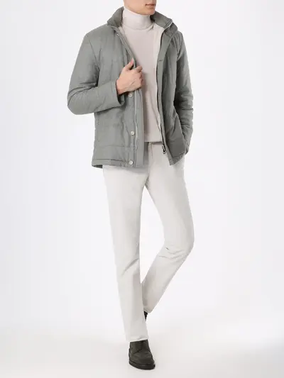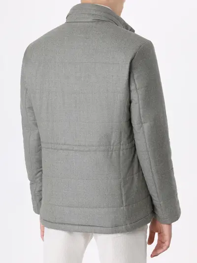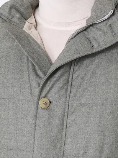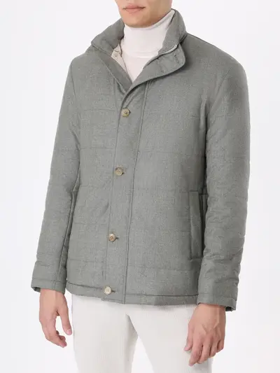 -Серо-зеленая утепленная стеганая куртка из шерсти от LUIGI BORRELLI. -Модель полуприлегающего силуэта с длинными рукавами, прорезными карманами, воротником-стойкой, застежкой на молнию и пуговицы, потайным капюшоном.