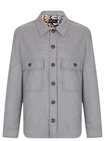 -Серо-бежевая куртка из шерсти от JACOB COHEN. -Модель рубашечного кроя с длинными рукавами, манжетами, отложным воротником, нагрудными накладными карманами, застежкой на пуговицы, нашивкой с логотипом бренда сзади.