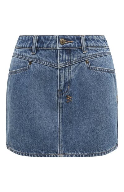 Синяя джинсовая мини-юбка автоматически сделает повседневный комплект более непринужденным. Для пошива модели использовали мягкий деним средней плотности, который хорошо держит форму и при этом отлично пропускает воздух. Изделие, прошитое коричневыми нитями, в готовом виде постирали, чтобы создать уникальный выбеленный эффект.