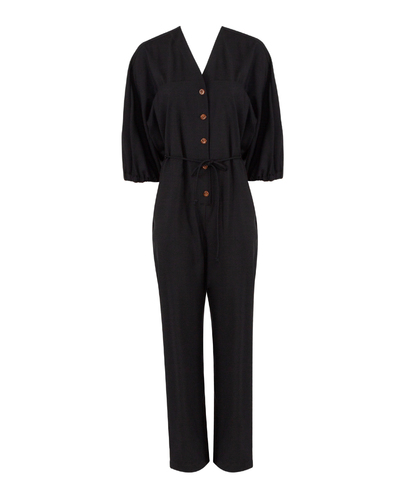 Комбинезон ALYSI из костюмной шерсти черного цвет. Модель приталенного силуэта с застежкой на пуговицы дополнена двумя карманами по бокам.