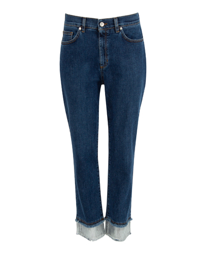 Джинсы PANICALE из плотного хлопкового денима синего оттенка. Модель зауженного к низу силуэта с высокой посадкой на талии и застежкой на молнию и пуговицу и пятью карманами. Двойная линия низа с бахромой и вставкой с серебряным покрытием.