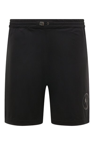 Свободные черные шорты длиной на несколько сантиметров выше колена – вне зоны риска и подходят абсолютно всем. Для пошива модели с боковыми карманами на молниях использовали прочный шелковистый нейлон с добавлением стрейчевых волокон, который не мнется, быстро сохнет и не требует особенного ухода. Изделие с широким регулируемым поясом-кулиской декорировали крупной эмблемой в тон.