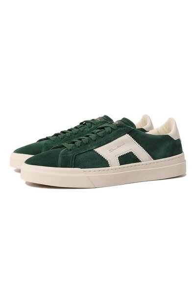 Мастера бренда, основанного супругами Сантони, использовали для создания кедов на широкой подошве прочную бархатистую замшу, которая быстро адаптируется к форме стопы. На фоне такого материала насыщенного зеленого оттенка особенно выразительно выглядят фигурные вставки сбоку и на заднике, подчеркнутые логотипом марки.