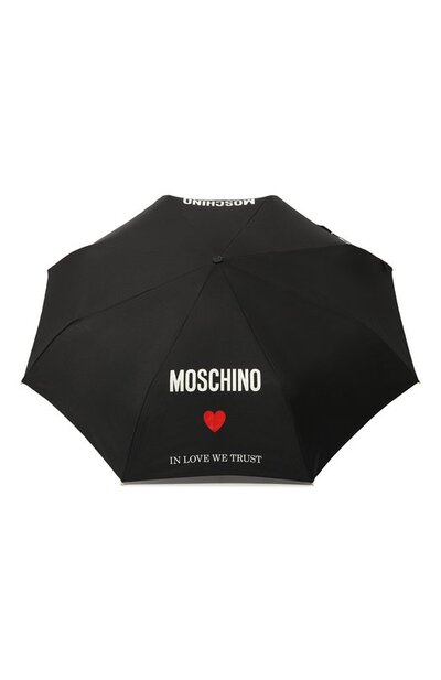 Каркас черного автоматического зонта изготовили из легкого металла, выдерживающего порывы сильного ветра. Купол из шелковистого плотного текстиля украсили брендированным принтом с надписью In love we trust. Ручку аксессуара с объемным логотипом дополнили прочной петлей из ленты, декорированной золотистой деталью.