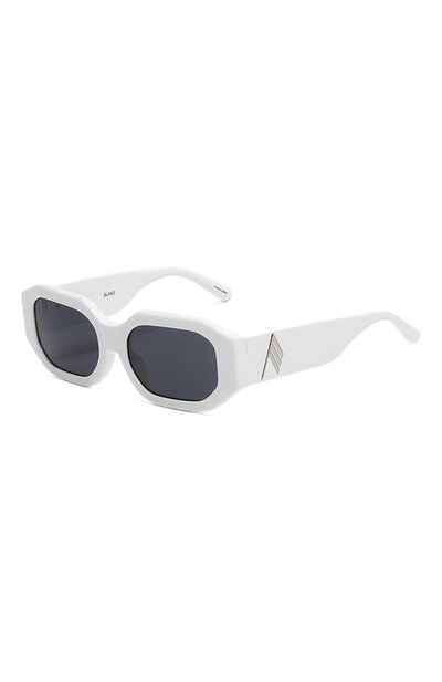 Белая оправа солнцезащитных очков получилась особенно легкой за счет гладкого ацетата, не боящегося случайных повреждений. Широкие дужки модели декорировали фактурной эмблемой в виде флага, выполненной из серебристого металла. Дымчатые полупрозрачные линзы изготовили из прочного нейлона, устойчивого к появлению царапин и потертостей.